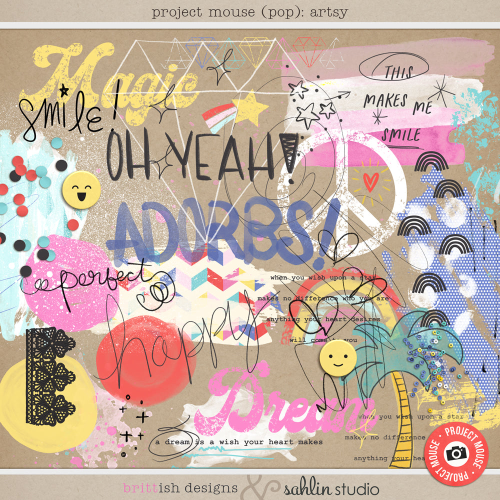 For this installment we bring you the "Project Mouse (Pop): Artsy". Some memories are so happy and fun and full of joy and sparkle you just need a big bold POP to capture the moment! This collection captures that upbeat, groovy feeling of our happy place. Perfect for almost anything! Retro, silly, girly, dreamy, rainbows, trendy, hip, photo walls, selfies, this kit has got you covered!!
